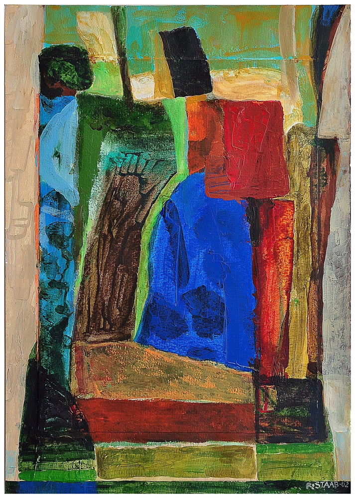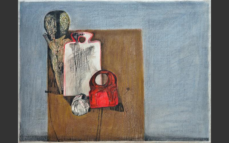Ausstellung in der Praxis von Dr.med. Volkmar Herkt 10. Stillleben mit blauem Objekt, 2002, Acryl auf Karton, 29,7x42cm - Ausstellung in der Praxis von Dr.med. Volkmar Herkt