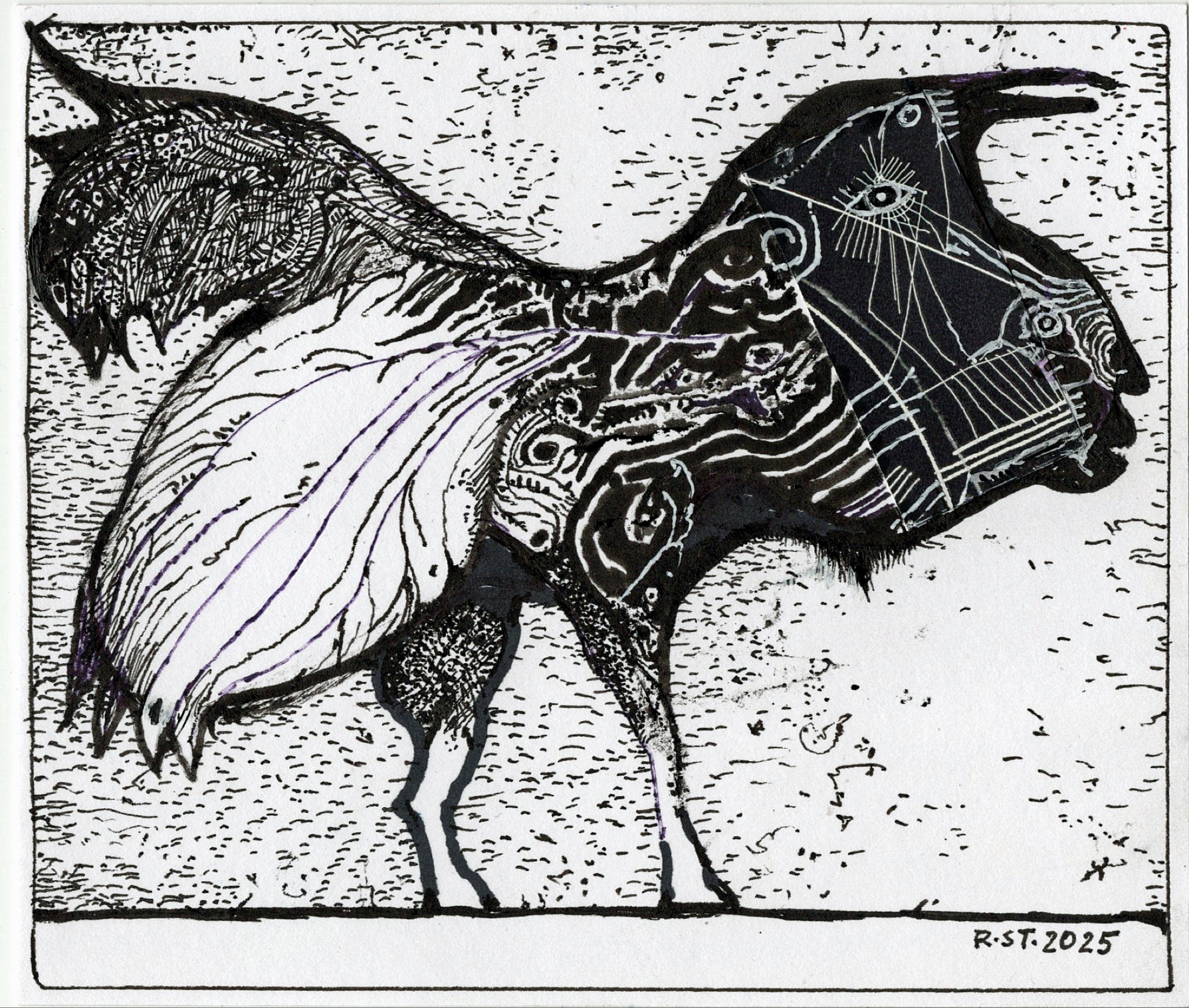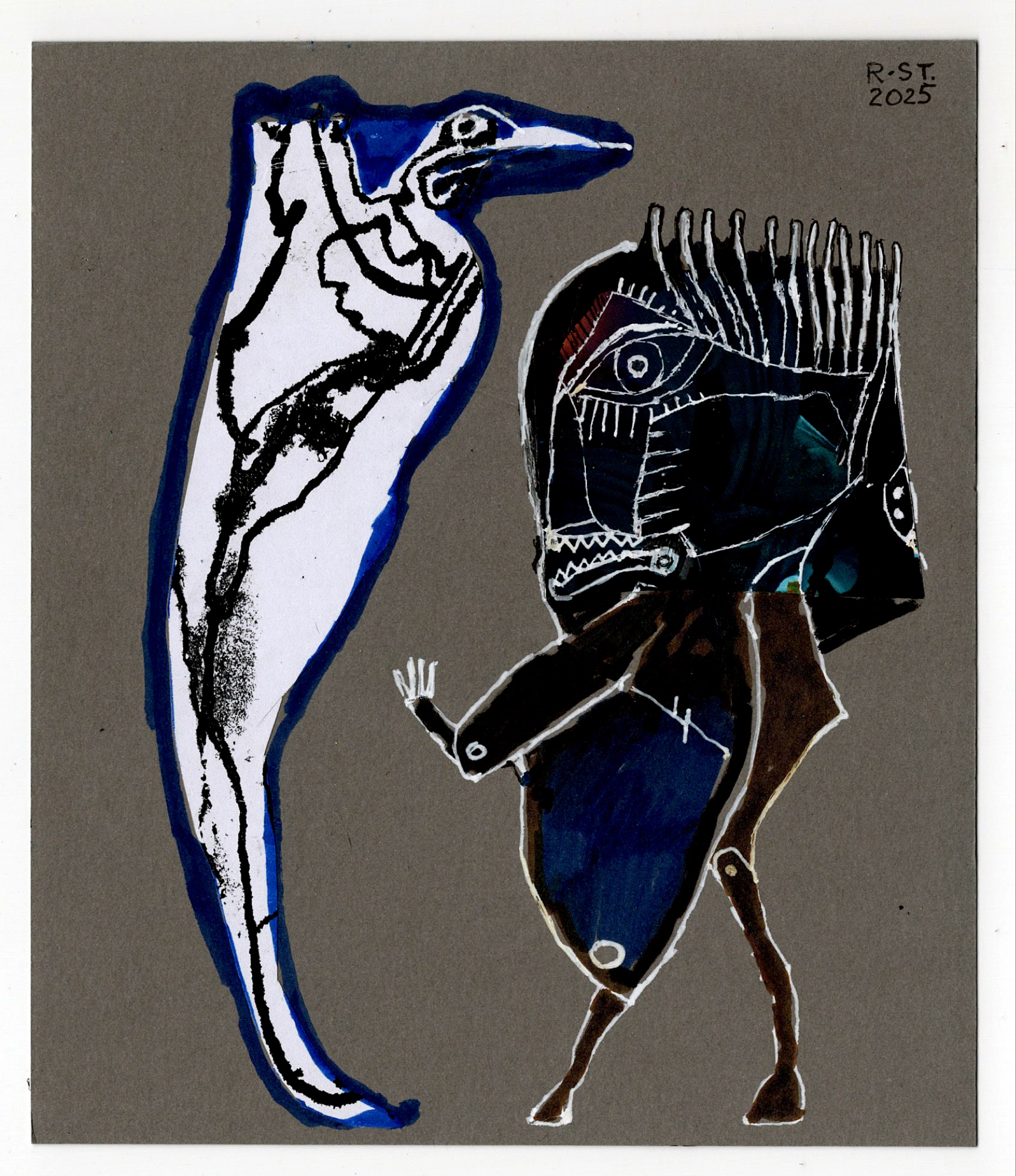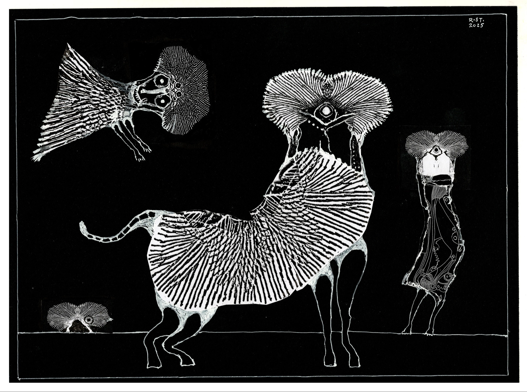 Die gezeigten Arbeiten bilden eine Auswahl aus einer fortlaufenden Serie von inzwischen über 200 Blättern. Jede Figur steht für sich, zugleich sind sie Teil eines offenen Systems von Erscheinungen, die sich nicht eindeutig zuordnen lassen – weder zoologisch noch erzählerisch. Sie bleiben in Bewegung, auch dann, wenn sie stillstehen.